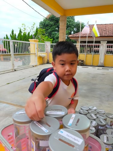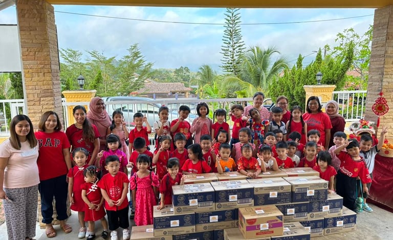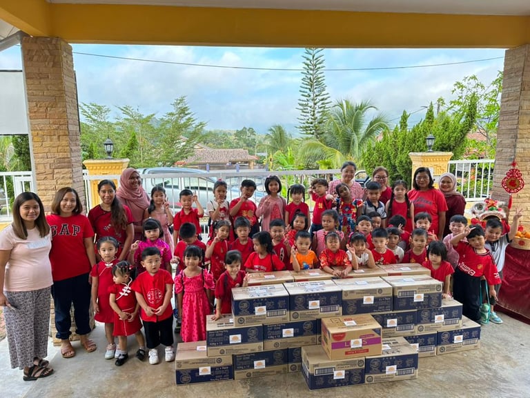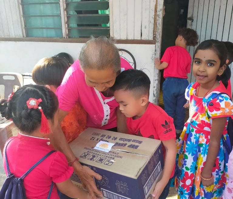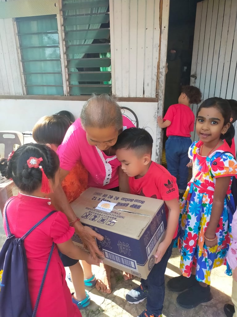 Example: In 2023, we conducted the Bamboo Bank with Jing Si Aphorism project. Each day, children dropped coins into a bamboo bank while reciting the Jing Si Aphorism quote, “Think good thoughts, speak kind words, do good deeds.” They collected a significant amount of money and collaborated with local leaders from Pengkalan Hulu, Kampung Tasek, and Klian Intan to distribute 30 food baskets to elderly individuals living alone in the community.