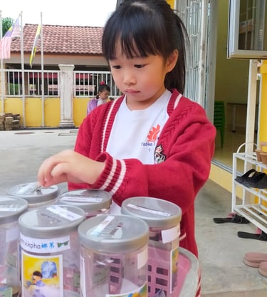 Visual Arts in preschool emphasizes the production and appreciation of creative works based on four fields which are drawing, pattern and design, form and build models and introduction to traditional crafts. Integration of these fields will give pupils’ opportunities to increase their interests, develop their personality, develop awareness and sensitivity to artistic values and the environment. Activities such as acorn art, fabric toy sewing, creative coloring, and puppet making practiced in TMC allow children to apply their knowledge in art production, explore various techniques and materials, and cultivate an appreciation for their own and others' creative expressions.